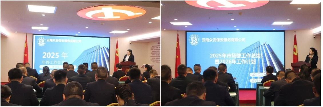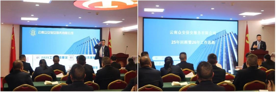 为全面复盘2025年度工作成效,科学谋划新一年发展蓝图,2026年2月7日,云南众安保安服务有限公司召开2025年度工作总结会议。会议紧紧围绕“复盘总结、查找不足、谋划未来”的主题,全面回顾过去一年工作,深入剖析存在问题,系统部署新年任务。公司领导班子、各部门及各项目副经理以上管理人员参加会议。