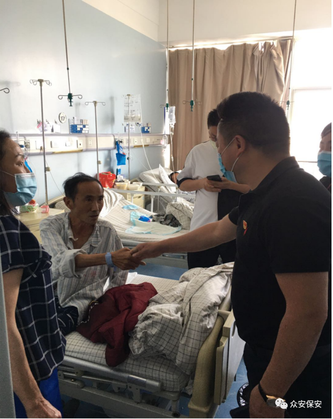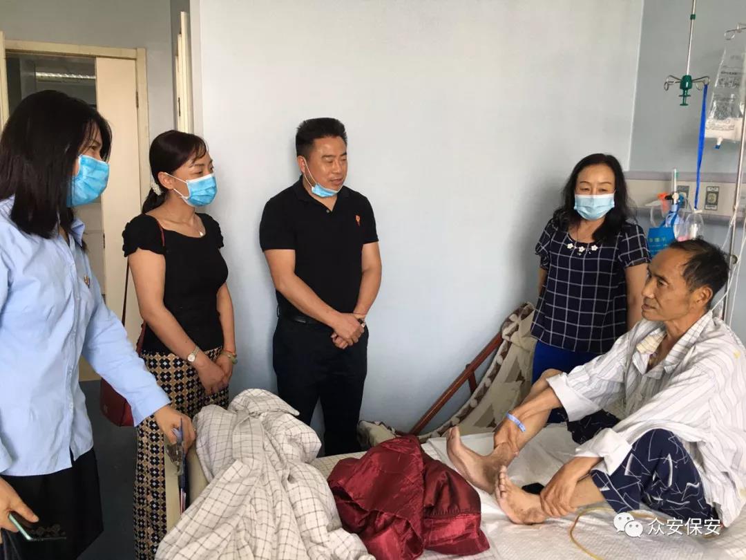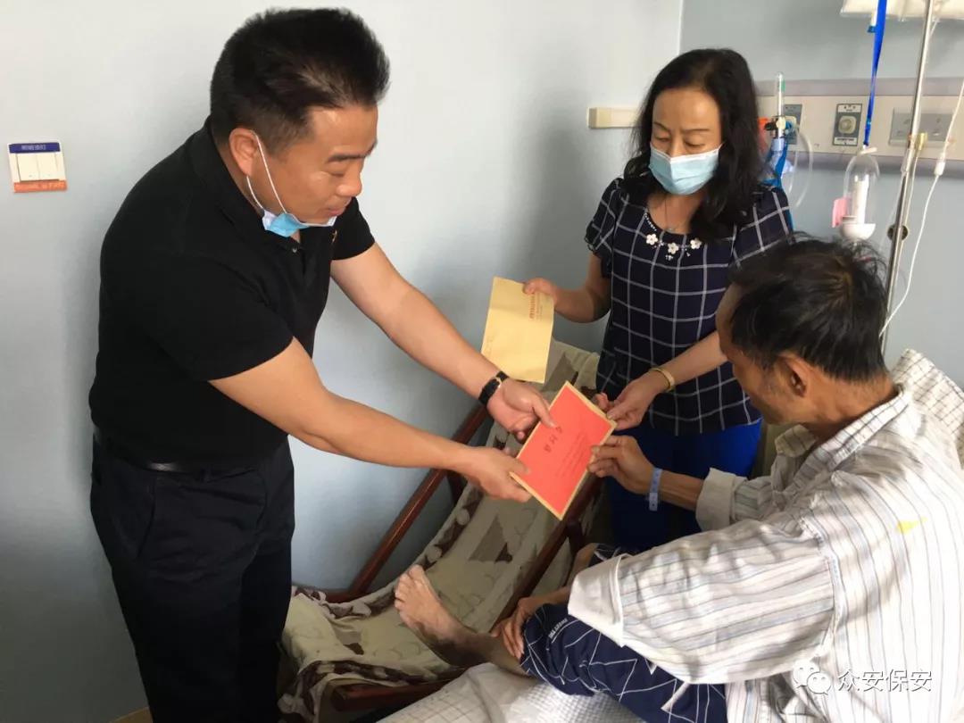 2020年5月15日下午,在昆明市西山区退役军人事务局马萍副局长、双拥优抚科李朝红科长率领下,云南众安保安服务有限公司党支部书记、总裁朱邦瑞,市场部总监赵辉,综合管理部主任郭立波一行5人,赴云南省肿瘤医院亲切看望并慰问越战参战老兵赵勇刚英雄。