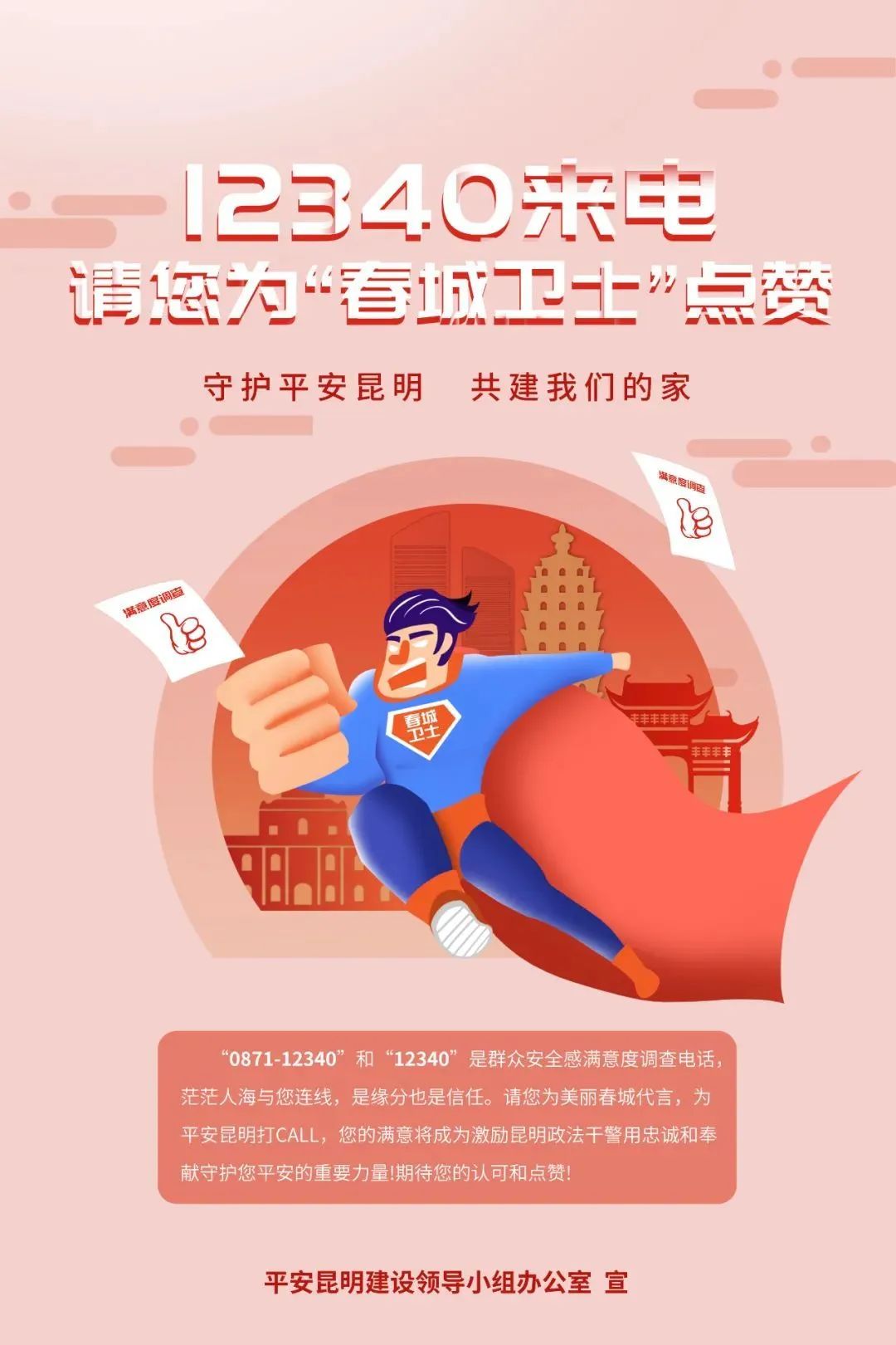 当您接到来自“12340”的调查电话时,请大家耐心听完调查员的提问,希望您们客观公正评价昆明社会治安良好状况,如问到您对当地社会治安是否满意时,请将昆明社会治安取得成效如实反映,为平安昆明点赞!